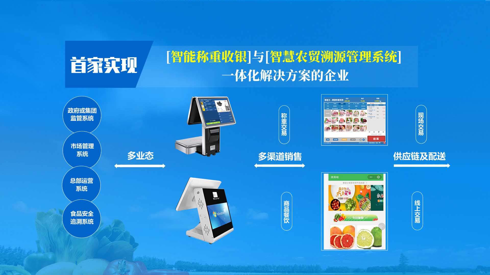 創(chuàng)新實(shí)現(xiàn)了【智慧農(nóng)貿(mào)溯源管理系統(tǒng)】與【智能稱重收銀】一體化解決方案,集市場管理、運(yùn)營管理、溯源追溯、智能收銀大數(shù)據(jù)運(yùn)用于一體,硬件、軟件與管理系統(tǒng)完美結(jié)合。適用于農(nóng)批、農(nóng)貿(mào)市場蔬菜、生鮮、水果、水產(chǎn)、肉類、熟食等稱重和非稱重銷售;由于采用一體化設(shè)計(jì),解決了傳統(tǒng)農(nóng)貿(mào)市場無法實(shí)現(xiàn)的信息化、智能化、可追溯的管理問題;使稱重、收銀、追溯、管理、更透明、公正、安全,讓顧客無后顧之憂,給管理工作帶來極大的便捷與高效,對國內(nèi)農(nóng)產(chǎn)品行業(yè)的發(fā)展、農(nóng)產(chǎn)品流通管理起到了典范作用。 【睿途士首創(chuàng)】顛覆傳統(tǒng)的“智慧農(nóng)貿(mào)市場系統(tǒng)”,解決了傳統(tǒng)農(nóng)貿(mào)系統(tǒng)單一安卓掛屏,昂視不方便看、不直觀、無互動(dòng)性,傳輸信息不齊全、不穩(wěn)定的問題,也解決了按鍵電子秤商品難找、商品代碼難記、按鍵操作不靈活、支付不智能,對收銀管理、銷售商品、菜名、菜價(jià)、打折、優(yōu)惠、會(huì)員、線上下單、采購等無法實(shí)現(xiàn)實(shí)際菜品交易和追溯等問題。 更具顛覆性的是睿途士智慧系統(tǒng)擁有三大管理平臺(tái)(市場管理平臺(tái)、總部運(yùn)營管理平臺(tái)、商戶后臺(tái)管理平臺(tái))、一個(gè)可視操作前臺(tái)和三大追溯功能,讓遠(yuǎn)程管理、數(shù)據(jù)傳輸、人機(jī)互動(dòng)、智能控制、移動(dòng)支付、大數(shù)據(jù)、互聯(lián)通信、云端存儲(chǔ)、人工智能、智能城市、電子定位、智能收銀等功能得以實(shí)現(xiàn)。